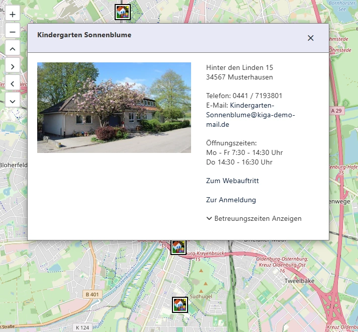 Die Eltern haben mit der neuen Kartenansicht einen Überblick über nahegelegende Kindergärten und deren Betreuungszeiten. Zusätzlich können sie ihr Kind bei dem Kindergarten anmelden.